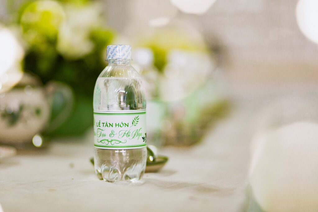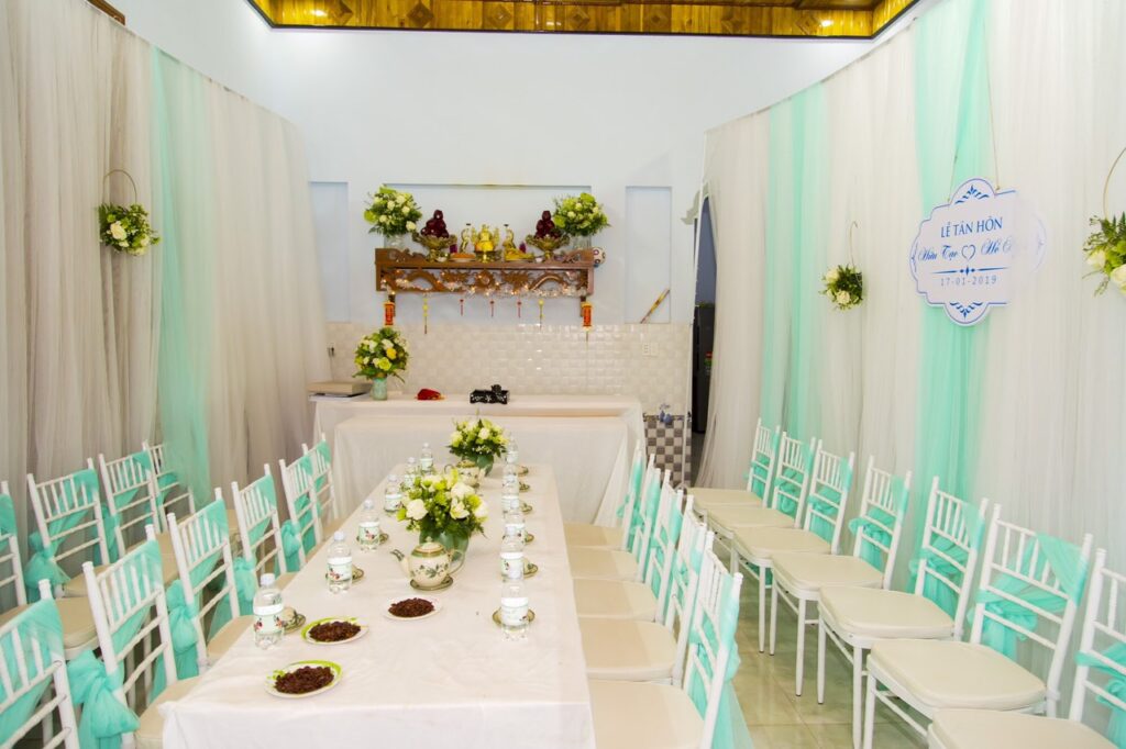 Đám cưới được decor với tông màu xanh và kem nhã nhặn cùng một ít hoa vàng nhẹ nhàng và thanh thoát.